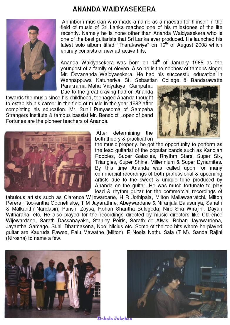 This page is created with information compiled by Rukshan Karunanayake, a Lead Guitarist/Composer/Melody Maker/Music Director who is also the Chairman of Clarence Wijewardane Fans Club of Sri Lanka. Rukshan Karunanayake is a 10th Grade student of Banadaranayake College of Gampaha, Sri Lanka in English Medium. Rukshan may be contacted by email at rukshan100@yahoo.com. He is looking forward to receiving corrections and additions to this page to make it as comprehensive as possible.