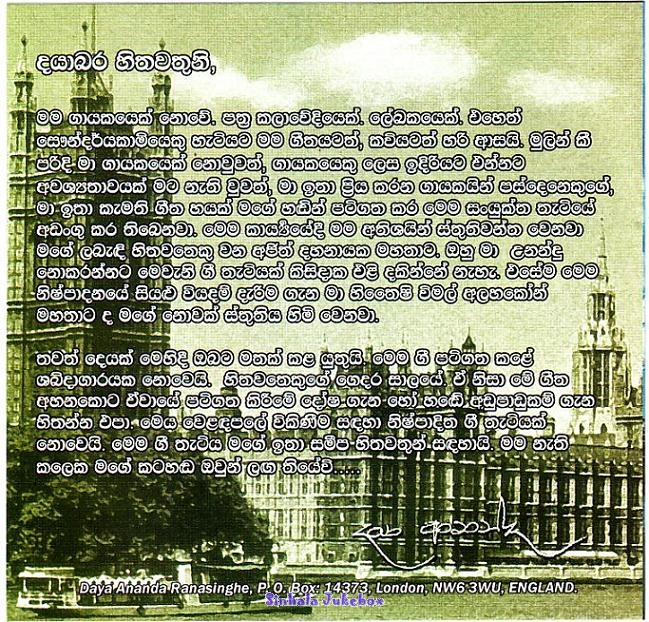 "Daya Ananda Ranasinghe, a veteran journalist and the founder publisher and editor of the only Sinhala Newspaper, Lanka Viththi, published in the UK and distributed to the Sri Lankan expatriate communities throughout the Globe, has released a CD under the title " Ma Sith Gath Gee". The CD contains six love songs of Dharmadasa Walpola, H. R. Jothipala , Mohideen Baig, Victor Ratnayake and the Hindi Maestro Mohamed Rafi.