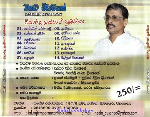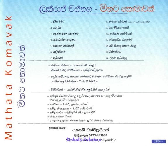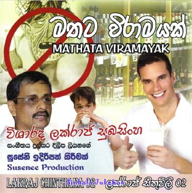 The first song he sang in a studio was Yakage Bothale(Devils bottle) which was composed by LakRaj himself and sung to the back ground music provided by Mr.Wijaya .V.Bandara, who included this in a cassette produced by him involving amateur singers. This maiden song received a lot of praise from many who heard it, mainly due to the message it carried ,and encouraged LakRaj to write more songs of this nature and along with few others on other topics as well, produced his own creation named Mathata Komavak (Comma for intoxication). Please listen to these songs and other popular hits from the following two albums.