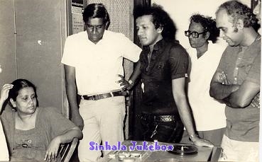The Ganga Addara photo taken when song was recorded with Vijay. People present from left to right are: (1) Sumitra Pieris (Film Director), (2) Sarath Fernando (who orchestrated the music), (3) Vijaya Kumarathinga (Singer Actor), (4) Augustus Vinagaratnam (who translated the lyric into Sinhala), and (5) Nimal Mendis.