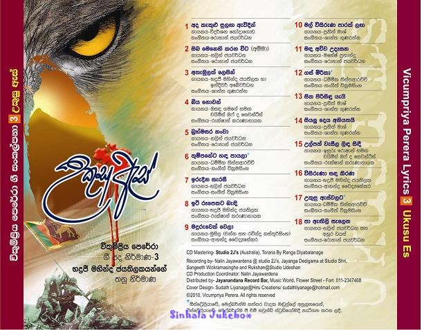 "Vicumpriya Perera Lyrics 03 - Ukusu Es" features 18 original songs written by Vicumpriya Perera. Tunes for all songs