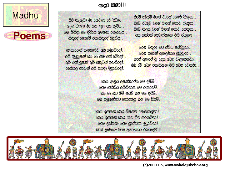 You are hereby invited to submit "Geetha Katha" for possible publication in this page. We reserve the rights to choose what will be presented, yet submitter is responsible for the content and not the page maintainers. We welcome all forms of creative work including but not limited to short stories, jokes, poems, and satire either in Sinhala and/or English.