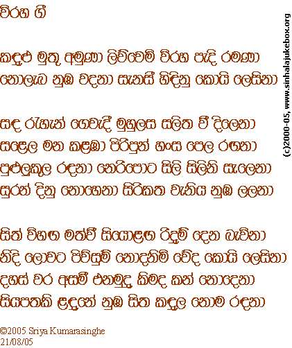 You are hereby invited to submit "Geetha Katha" for possible publication in this page. We reserve the rights to choose what will be presented, yet submitter is responsible for the content and not the page maintainers. We welcome all forms of creative work including but not limited to short stories, jokes, poems, and satire either in Sinhala and/or English.